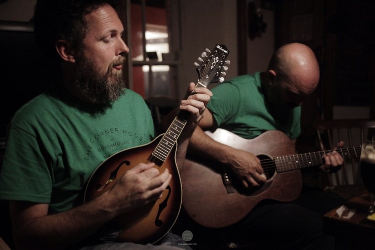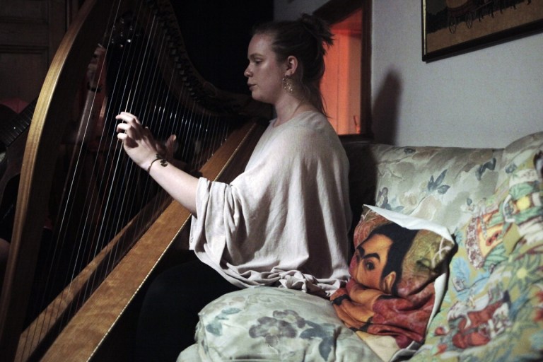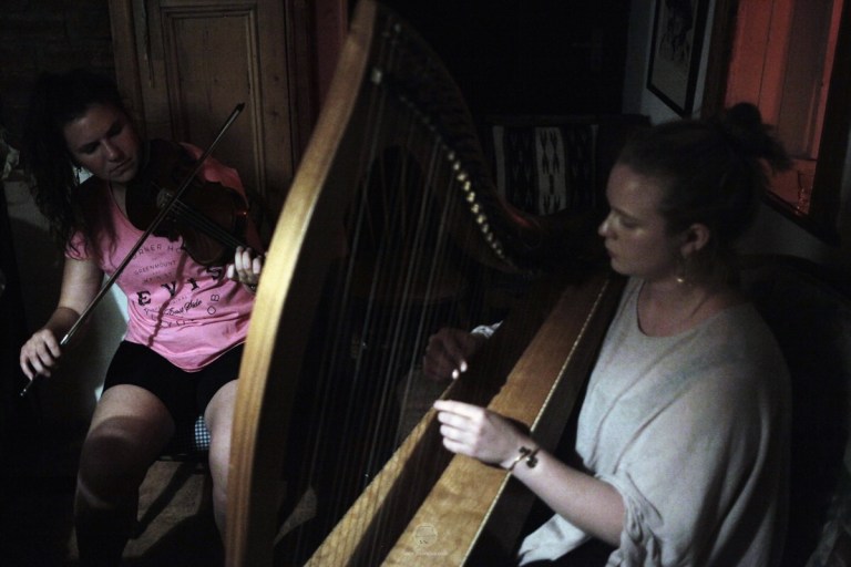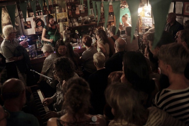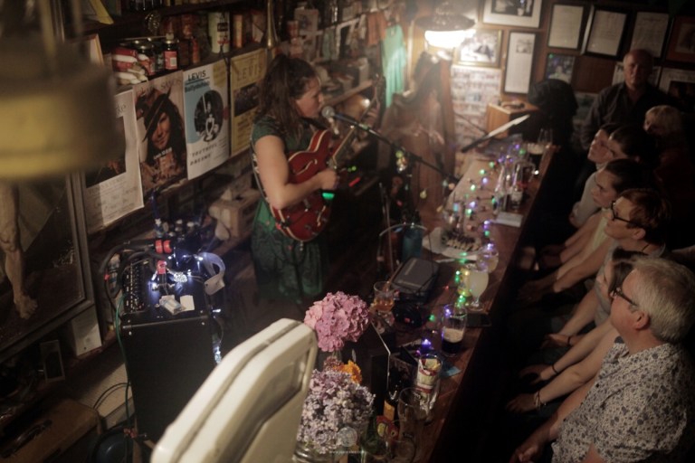 The bar, full, the middle room, full, outback, full. Clare Sands & Aisling Urwin with Liam Ó Maonlaí rewilding Levis Corner House, 10 August 2019.